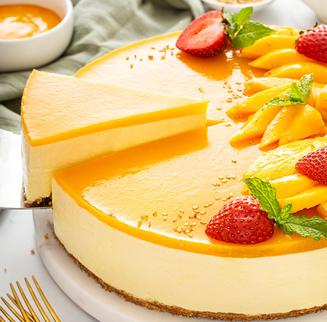 Silky cheesecake with juicy mango slices.